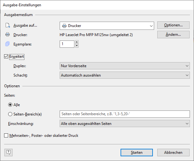 Sofern Sie den Druck aus dem übergeordneten Programm aufrufen, wird nach Auswahl der gewünschten Druckvorlage in der Regel der Dialog für die Ausgabe-Einstellungen angezeigt.