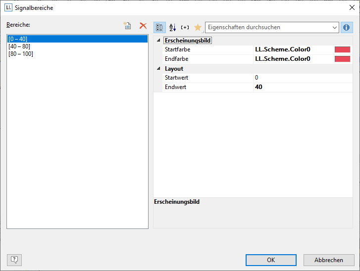 5. Bestimmen Sie z.B. die Einfärbung des Signalbereichs um den optimalen Bereich zu signalisieren. Setzen Sie dazu die Eigenschaft "Signalbereiche" auf "Anzeigen" und öffnen Sie über die "..." – Schaltfläche den Dialog zur Definition der Bereiche. In diesem Dialog erstellen Sie über die "Neu"-Schaltfläche die jeweiligen Bereiche mit Start- und Endwert und weisen die gewünschte Farbe zu.