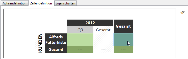 In Kreuztabellen können Sie ebenfalls einzelne Zellen selektieren. Öffnen Sie dazu in die Eigenschaften der Kreuztabelle und wechseln Sie auf die Registerkarte "Zellendefinition".
