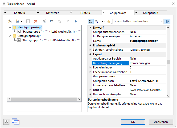 Über die Zeileneigenschaft "Gruppieren nach" wird bestimmt, wie die Daten gruppiert werden. D.h. jedes Mal wenn sich das Ergebnis des Ausdrucks von einer Datenzeile zur nächsten ändert, wird die Zeile gedruckt. Wenn kein Ausdruck angegeben wird, wird die Zeile nicht gedruckt und die Eigenschaft wird im Eigenschaftenfenster rot hervorgehoben.