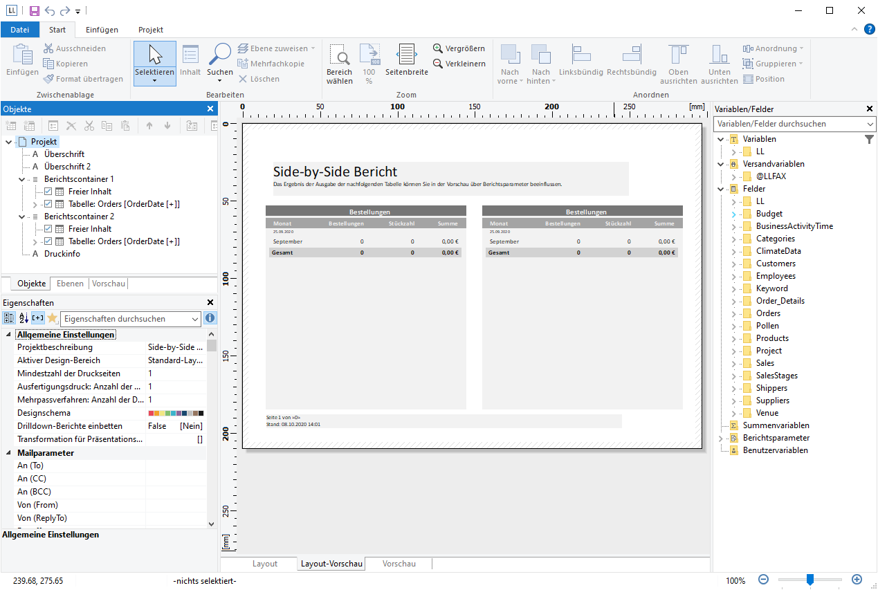 Sie können beliebig viele Berichtscontainer verwenden, damit lassen sich z.B. klassische Side-by-Side Berichte erzeugen. Die Datenquellen der Berichtscontainer können sich dabei unterscheiden.