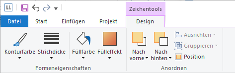 Wenn Sie ein Zeichnungsobjekt (Linie, Rechteck, Ellipse) eingefügt haben, werden die Zeichentools sowie die Registerkarte Design angezeigt. Die Registerkarte enthält die Befehle, die Sie zum Arbeiten mit Zeichenobjekten benötigen (u.a. Strichdicke, Konturfarbe).