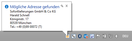 ▪ Das address pick-up blinkt und sofern Sie die Clipboardüberwachung aktiviert haben, meldet sich der address pick-up mit einer Sprechblase "Mögliche Adresse gefunden".