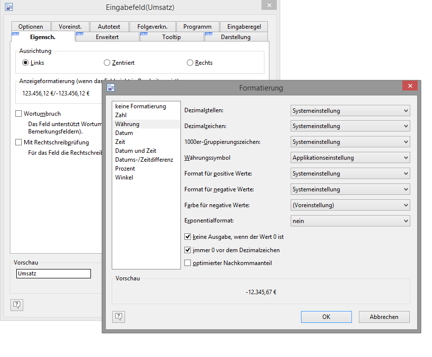 Für alle Eingabefelder, Comboboxen und Statischen Texte steht ein Formatierungsdialog zur Verfügung. Die Formatierung bezieht sich dabei auf das Ergebnis des gesamten Ausdrucks.