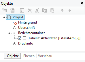 Ein Berichtscontainer kann mehrere Tabellen-Objekte, Kreuztabellen-Objekte und Chart-Objekte enthalten.
