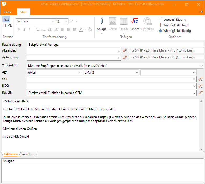 In einer E-Mail-Vorlage ist der gesamte Aufbau der E-Mail, inkl. Betreff, Text, Feldvariablen, Formatierungen (HTML-E-Mails) und eventuellen Anlagen enthalten. Abgespeichert lassen sie sich immer wieder verwenden. Diese Vorlagen funktionieren ähnlich wie die Dokumentvorlagen in Ihrer Textverarbeitung.