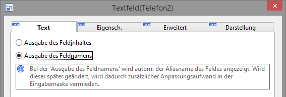 Auf der Registerkarte "Text" können Sie aber bestimmen, ob der aktuelle Feldinhalt (also z. B. "combit Software GmbH") oder der Feldalias bzw. Feldname (wenn Feldalias leer) angezeigt wird (also z. B. "Firma").