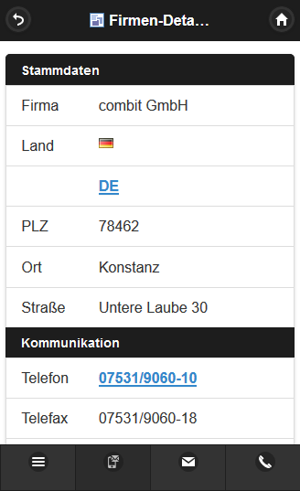 ▪ 1:N Relation: Auswahl einer 1:N oder N:M-Relation der Ansicht, um in die jeweilige Ansicht zu wechseln und die verknüpften Datensätze anzuzeigen oder einen neuen Datensatz zu erstellen (z. B. Ansprechpartner, Aktivitäten).