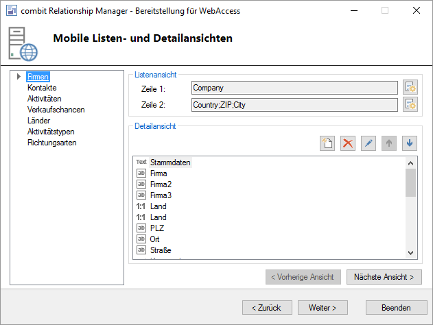 10. Mobile Listen- und Detailansichten (Nur WebAccess Mobil): Definieren Sie die Felder, die in der Listenansicht und Detailansicht der jeweiligen Ansicht angezeigt werden sollen.