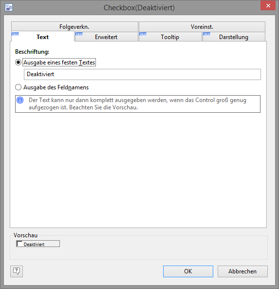 Auf der Registerkarte "Text" geben Sie die Beschriftung für die Checkbox an.