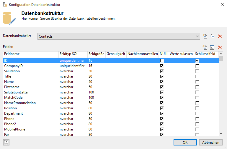 ▪ Schlüsselfeld: In jeder Tabelle kann nur ein (Primär-)Schlüsselfeld definiert werden (z. B. ID). Die Option kann nur dann auf ein Feld angewandt werden, wenn noch kein Schlüsselfeld in der Tabelle definiert wurde. Zum Ändern eines bestehenden Schlüsselfeldes benötigen Sie ein Datenbank-Konfigurationswerkzeug (z. B. Microsoft SQL Server Management Studio, pgAdmin).