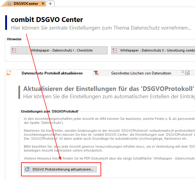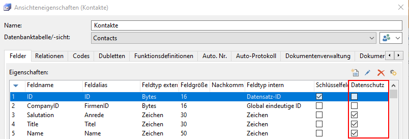 Änderungen der Datenbankstruktur kann zu Fehlern im DSGVO-Protokoll führen. Sobald Felder mit aktivierter Datenschutz-Checkbox gelöscht/geändert werden, müssen die Trigger für die DSGVO-Protokollierung über die Schaltfläche 'DSGVO Protokollierung aktualisieren' neu erzeugt werden.