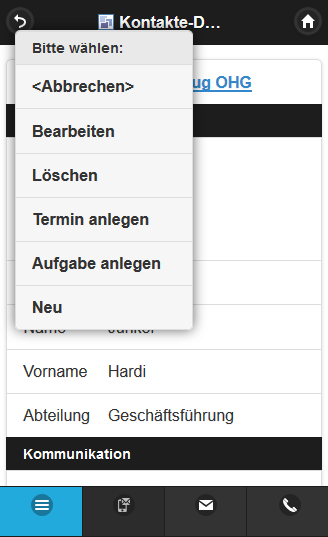 Ein Datensatz kann über das Menü bearbeitet, gelöscht oder neu erfasst werden.