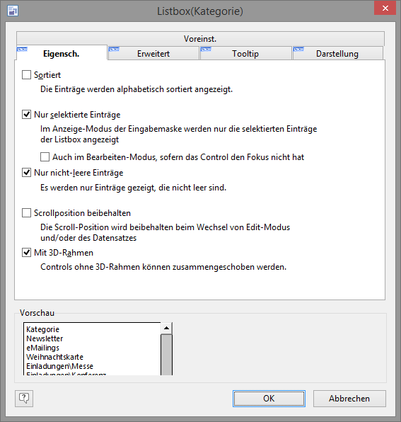 Bei gesetzter Option "Auch im Bearbeiten-Modus sofern das Control den Fokus nicht hat" werden selbst im Änderungsmodus nur die selektierten Einträge angezeigt. Erst wenn in das Codefeld geklickt wird, werden alle Codeeinträge angezeigt und können ausgewählt werden.