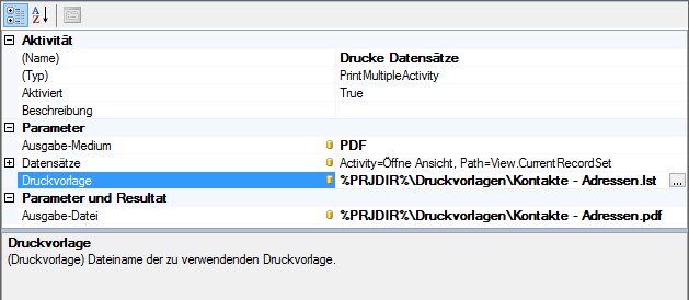 Die bei einigen Aktivitäten vorhandene Rubrik "Resultat" enthält entsprechende Ergebniswerte der jeweiligen Aktivität, z. B. ein ausgelesener Feldinhalt bei der Aktivität "Lies Feldinhalt". Dieses Resultat kann dann an eine Folgeaktivität übergeben werden.