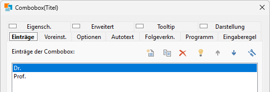 Auf der Registerkarte "Einträge" werden die Combobox-Inhalte definiert.