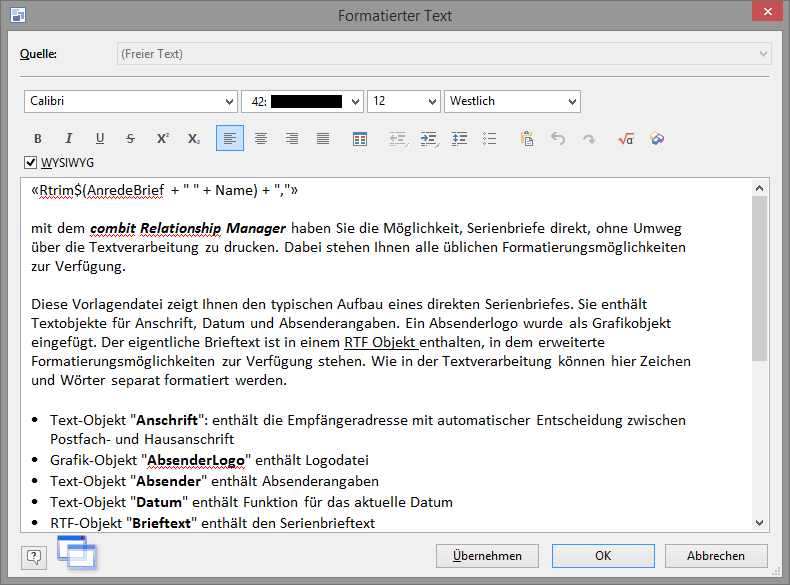 ▪ Doppelklicken Sie auf das Objekt "Formatierter Text" um den eigentlichen Brieftext einzugeben. Sie können diesen auch aus einem bestehenden Brief aus ihrer Textverarbeitung kopieren.