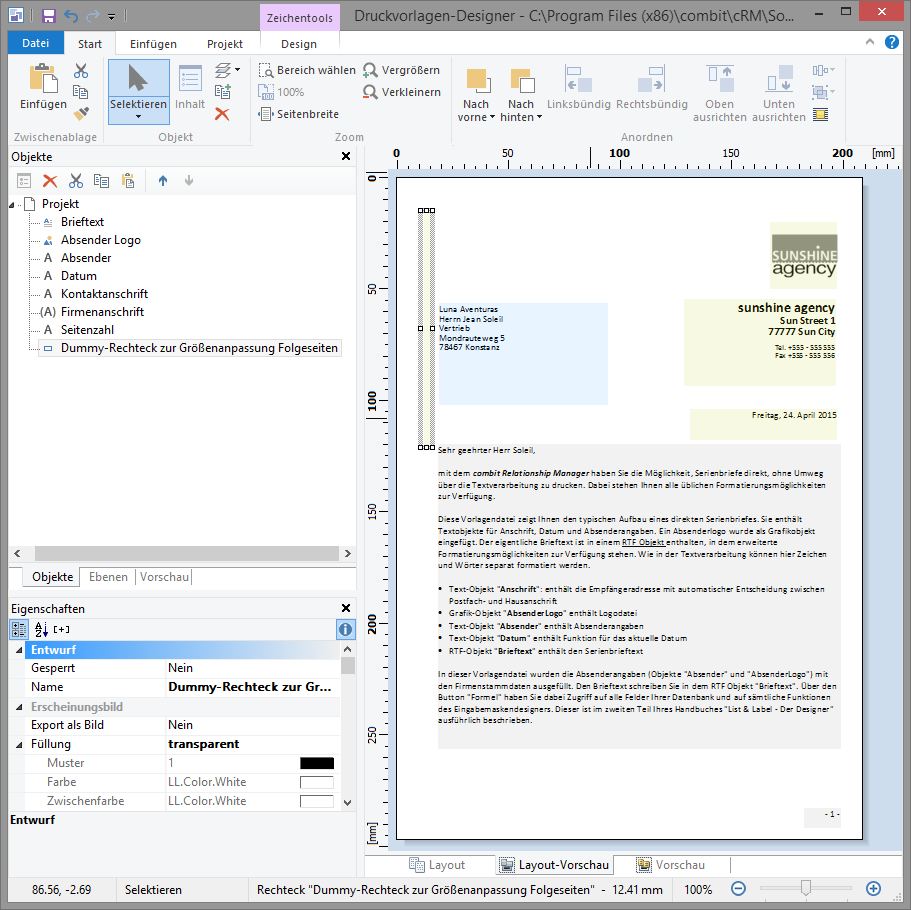 ▪ Die einzelnen Bestandteile (Anschrift, Absender, Logo und Text) werden wie bei einem Etikett jeweils als Objekte auf der Arbeitsfläche platziert.
