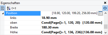 ▪ Möglichkeit 2: Damit der Brieftext auf der Folgeseite am oberen Blattrand beginnt, wird die Position (oben, Höhe) des Objekts "Brieftext" mit einer Bedingung gesetzt, die auf den Folgeseiten das Textfeld nach oben verschiebt und in der Höhe vergrößert. Beachten Sie, dass die Bedingung bei Größenänderungen des Objekts verloren gehen kann.