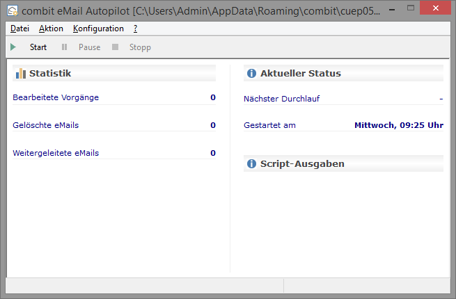 ▪ Das Programmfenster gibt dabei Auskunft über die Statistik (Bearbeitete, gelöschte und weitergeleitete E-Mails), den Bearbeitungsstatus (Nächster Durchlauf, Start) und die Script-Ausgaben.
