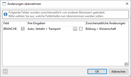 Wenn mehrere Benutzer gleichzeitig im gleichen Datensatz dasselbe Feld ändern, stellt sich die Frage, wessen Daten denn nun übernommen werden soll. In diesem Fall öffnet sich automatisch ein Dialog, der die von Ihnen vorgenommenen Änderungen, sowie die von anderen Benutzern vorgenommenen Änderungen auflistet.