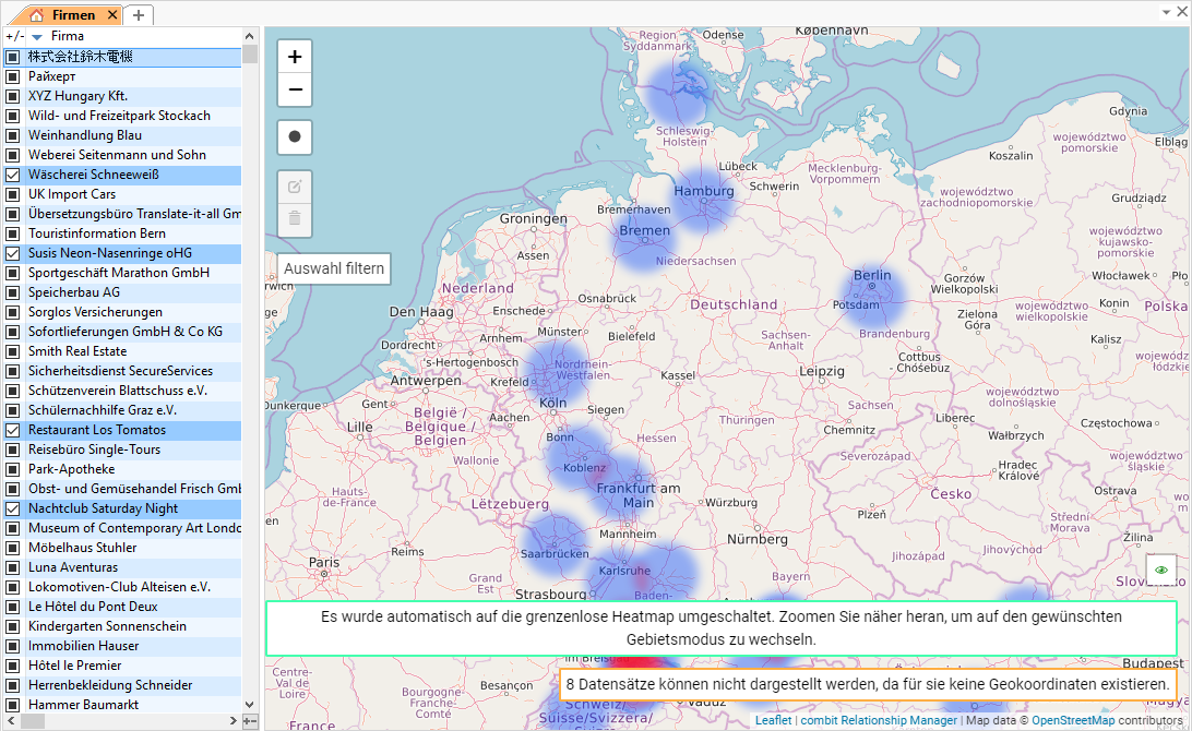 In der Ansicht "Heatmap" werden die gefilterten Adressen visuell gemäß einem Feld auf der Karte visualisiert.