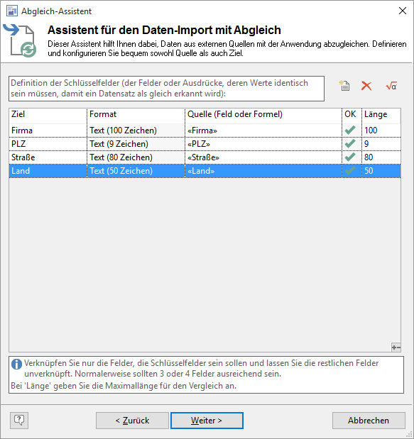 Die Firmendaten werden mit der Ansicht "Firmen" abgeglichen. Schlüsselfeld für den Abgleich ist die Kombination "Firmenname+Straße+Postleitzahl+Land", da diese Kombination für die spätere SQL-Abfrage sowieso eindeutig sein muss (weitere Informationen zum Abgleich siehe Kapitel Abgleich von Daten). Dabei wird die Kombination "Firmenname+Straße+Postleitzahl+Land" zusätzlich in das Feld "Z_Import_PK" importiert.