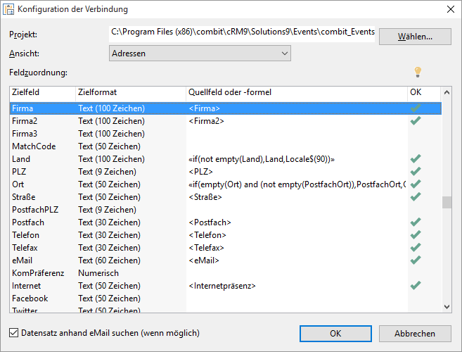 Tipp: In der mitgelieferten Solution "Large" steht Ihnen die Ansicht "Adressen" zur Verfügung. In diese Ansicht können Adressen übernommen werden. combit CRM teilt die Datensätze vollautomatisch in Firmen und Kontakte auf und verknüpft diese. Weitere Informationen siehe Import von Adressen im Kapitel Importieren und Exportieren.
