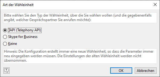 Wählen Sie zuerst die Wähleinheit aus. Die am weitesten verbreitete Wählschnittstelle ist TAPI. Die entsprechenden Treiber sind im Lieferumfang der meisten Telefonanlagen, beziehungsweise der Endgeräte enthalten. Ansonsten sollten Sie sich beim Hersteller nach einem TAPI-Treiber erkundigen.