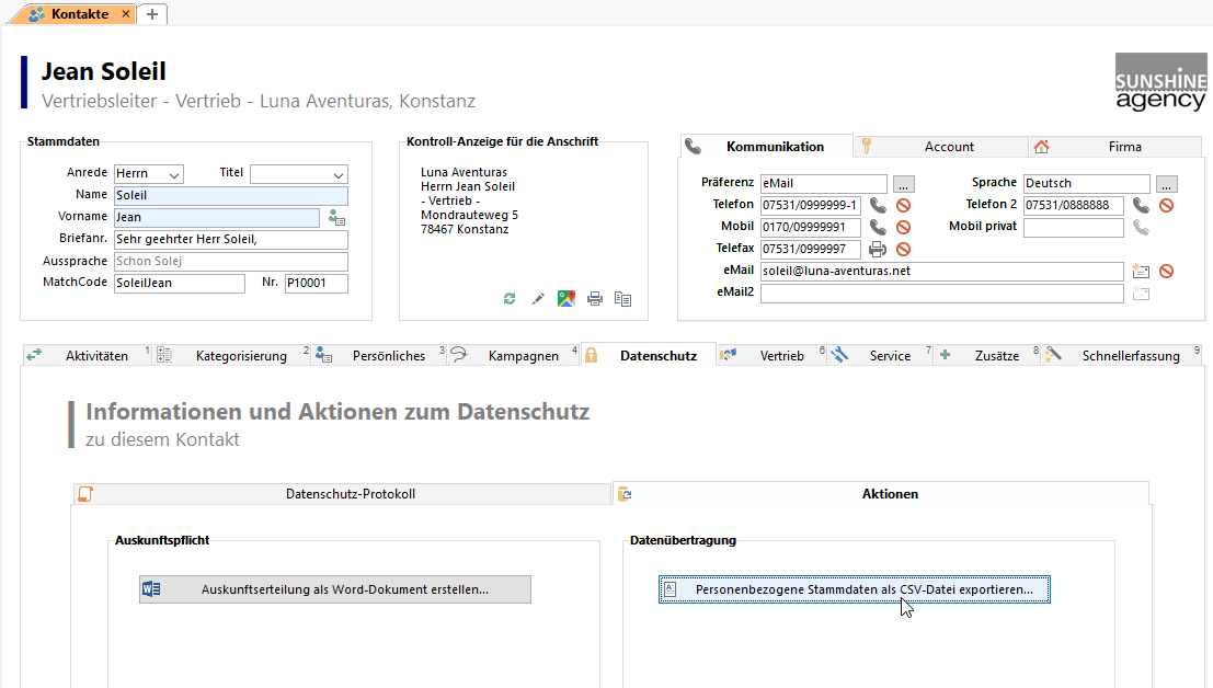 Auch hier werden Sie von der combit CRM-Software unterstützt: Mit einem simplen Klick auf die entsprechende Schaltfläche wird direkt eine in der Exportvorlage hinterlegte Auswahl an Stammdaten-Feldern für den aktuellen Kontakt als CSV-Datei erzeugt.