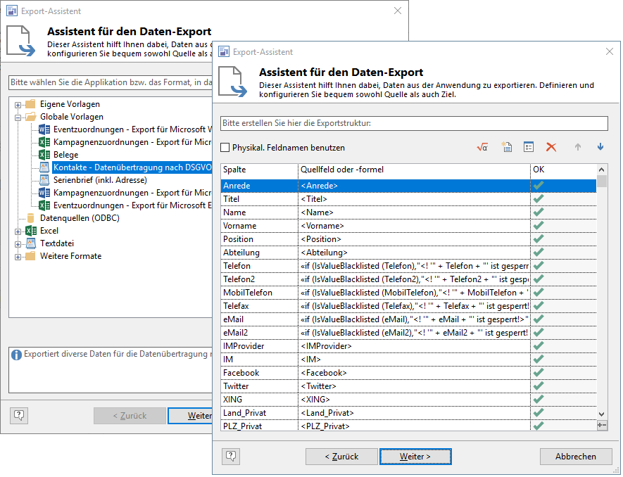 Machen Sie die DSGVO-Standard-Export-Vorlage zu Ihrer eigenen Export-Vorlage. Sie können diese Vorlage entweder 1:1 zu verwenden oder an Ihre individuellen Felder anpassen.