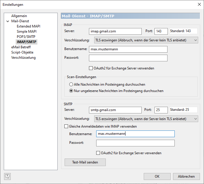 Der Anmeldedialog wird für jede Protokollart (POP3, IMAP, SMTP) einmal angezeigt, d. h. wenn das SMTP-Protokoll z. B. bereits über 'Datei > Konto > Mailversand > SMTP Konfiguration' konfiguriert wurde, wird er nach Aktivieren der Checkbox beim SMTP-Versand nicht mehr angezeigt.