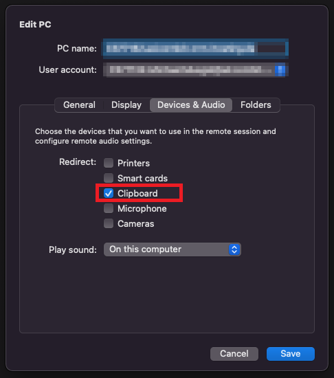 Um Dateien über die Zwischenablage zu übertragen, aktivieren Sie in den Verbindungseinstellungen den Punkt 'Clipboard' (Zwischenablage).