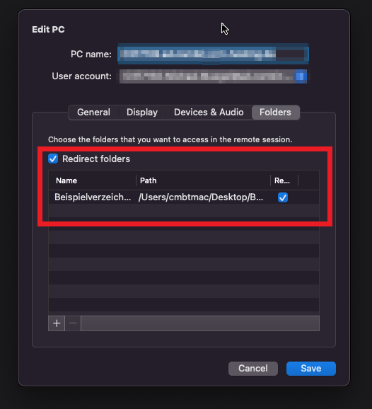 Um ein virtuelles Laufwerk im Host-System anzuzeigen, aktivieren Sie auf der Registerkarte 'Folders' (Ordner) die Option "Redirect Folders" und definieren dann ein Verzeichnis.