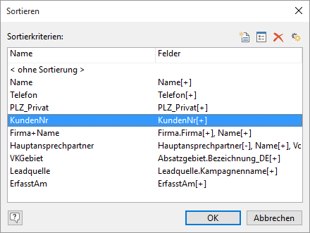 Für die Definition einer Sortierung stehen Ihnen alle Felder der aktuellen Ansicht und alle Felder von denjenigen Ansichten zur Verfügung, die über eine direkte 1:1-Relation verknüpft sind.