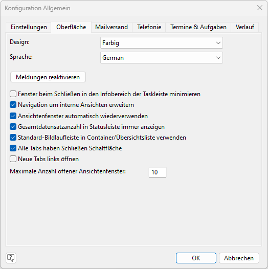 ▪ Maximale Anzahl offener Ansichtenfenster um zu vermeiden, dass zuviele Ansichten geöffnet sind und es dadurch zu Leistungseinbußen kommt.