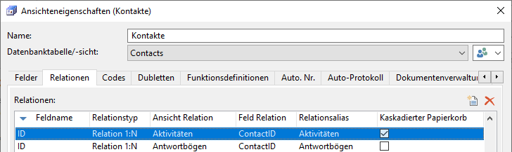2. Im Reiter 'Relationen' der Ansichteneigenschaften definieren Sie dann, welche relational verknüpften Datensätze beim Löschen des Datensatzes der aktuellen Ansicht mitgelöscht werden sollen. Wenn Sie die Checkbox 'Kaskadierter Papierkorb' für eine Relation auf eine bestimmte Ansicht aktivieren, werden alle relational verknüpften Datensätze dieser Ansicht für den aktuellen Datensatz mitgelöscht. Sie können diese Checkbox nur aktivieren, wenn in dieser Ansicht ebenfalls eine 'Papierkorb-ID' vorhanden ist (siehe Schritt 1).