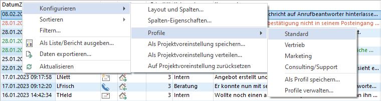 ▪ Um ein Spaltenlayout als Profil zu speichern, klicken Sie mit der rechten Maustaste auf einen Spaltentitel und wählen Sie Konfigurieren > Profile > Als Profil speichern.