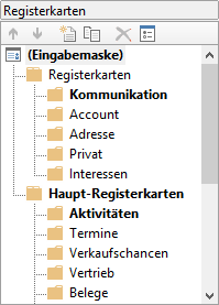 ▪ Registerkarte verschieben: Die eingefügten Registerkarten erscheinen in der Eingabemaske in einer bestimmten Abfolge hintereinander. Diese Abfolge entspricht der Reihenfolge im Toolfester "Registerkarten". Um eine Registerkarte an eine andere Position innerhalb der Abfolge zu verschieben, klicken Sie in der Registerkarten-Übersicht auf die entsprechende Registerkarte und verschieben Sie diese über die beiden Pfeile in demselben Fenster an die gewünschte Stelle.