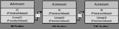 Wenn Firmen und Kontakte in einer gemeinsamen Ansicht "Adressen" geführt werden, benötigen Sie eine 1:N-Relation vom Primärschlüsselfeld (ID) auf das Fremdschlüsselfeld (GroupID, Verbindung zur Nebenadresse), und eine 1:1-Relation vom Fremdschlüsselfeld (GroupID) auf das Primärschlüsselfeld (ID, Verbindung zur Hauptadresse).