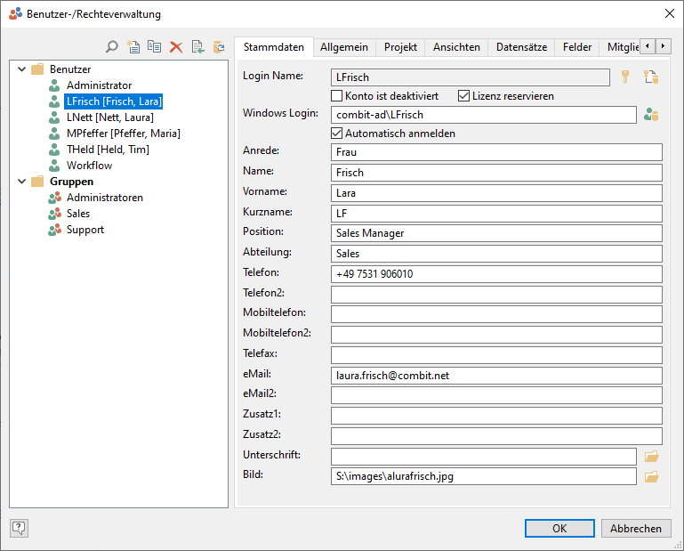 Nach Selektion eines Benutzers können über die Registerkarte "Stammdaten" die Benutzeranmeldung und die Benutzer-Stammdaten (z. B. Name, Abteilung, Telefon, E-Mail) hinterlegt werden. Die Stammdaten stehen auch beim Druck als Variablen zur Verfügung.