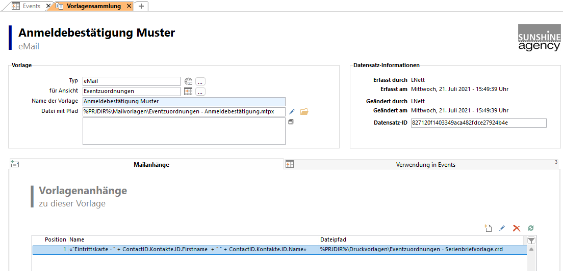 5. Bei Mailvorlagen können Sie über die Registerkarte 'Mailanhänge' eine individuelle Druckvorlage als Anlage definieren, z. B. ein individuelles Ticket mit QR-Code.