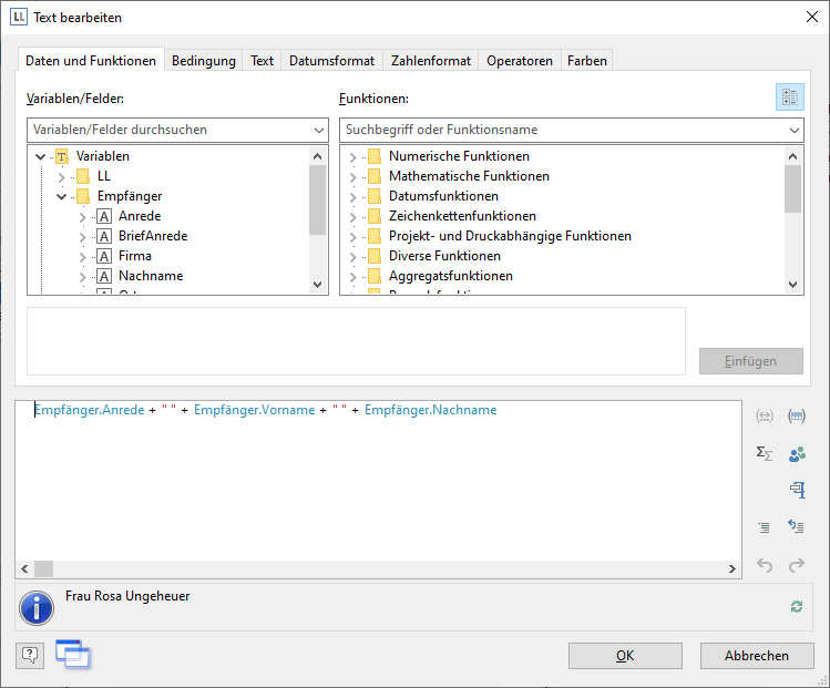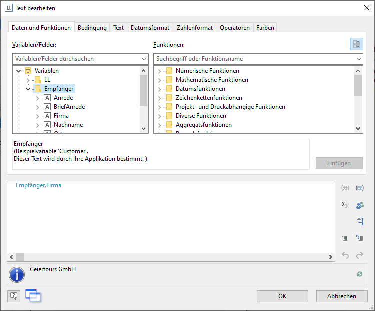 Dieser Dialog besteht aus einer Reihe von Registerkarten. Auf der Registerkarte "Daten und Funktionen" wählen Sie aus der Liste der verfügbaren Variablen und Felder die Variable für die Firmenanschrift aus (Firma).