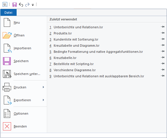 Über die blaue Schaltfläche links oben gelangen Sie in das Datei-Menü. Hier finden Sie Befehle zum Speichern und Verwenden des Druckprojekts und die Projektoptionen.