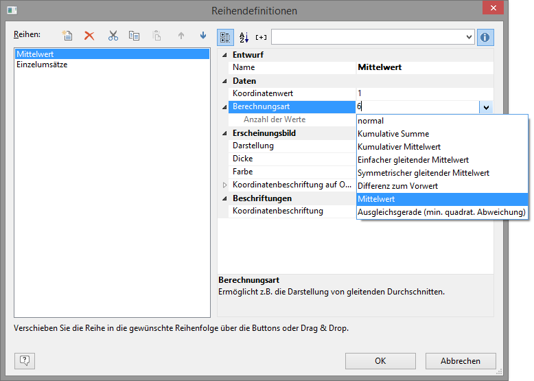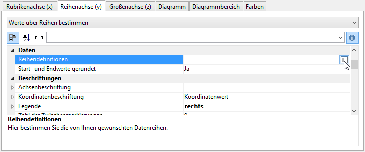 Damit ändern sich die Eigenschaften der Reihenachse und es steht über die Eigenschaft "Reihendefinitionen" ein Dialog zur Definition der Reihen zur Verfügung.