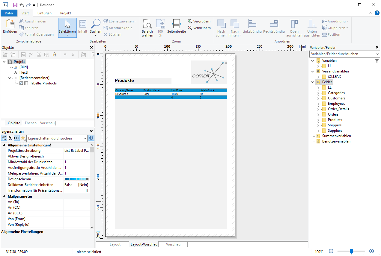 Um eine Tabelle in den Bericht einzufügen verwenden Sie das Objekt "Berichtscontainer". Ein Berichtscontainer kann – wie der Name schon andeutet – mehrere Objekte enthalten: Tabellen, Diagramme und Kreuztabellen können in beliebiger Abfolge eingefügt werden.