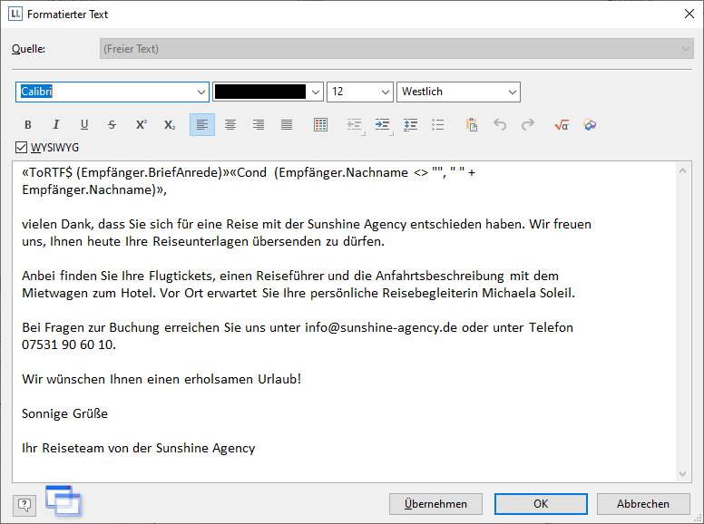 3. Daraufhin erscheint ein Dialog über den Sie den Brieftext als fortlaufenden Text schreiben können.