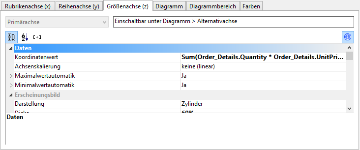 5. Bestimmen Sie den Koordinatenwert der Größenachse (z-Achse), d. h. die Höhe der Balken, also den Umsatz. Doppelklicken Sie in die Eigenschaft "Koordinatenwert".