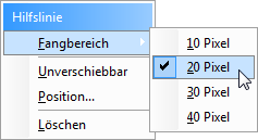 Die Optionen zu Hilfslinien werden über ein Kontextmenü definiert, das Sie über Rechtsklick auf eine Fanglinie erreichen. Damit können Sie für jede Hilfslinie einen Fangbereich in Pixel wählen. Wenn Sie der Hilfslinie dann so nahekommen, dass Sie nur noch diese Anzahl von Pixel von ihr entfernt sind, wird das Objekt auf die Hilfslinie gezogen. Wenn beim Arbeiten mit Objekten die Strg-Taste gedrückt wird, ist die Fangfunktion generell ausgeschaltet.
