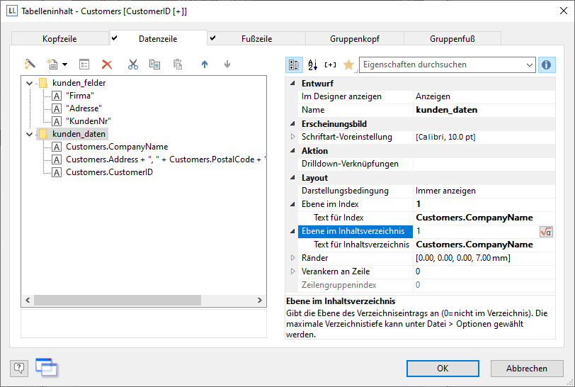 Sie können für Berichtscontainer-Elemente und Zeilendefinitionen in Tabellen über die Eigenschaft "Ebene im Inhaltsverzeichnis" bzw. "Ebene im Index" einen Eintrag für ein Inhaltsverzeichnis bzw. einen Index definieren.